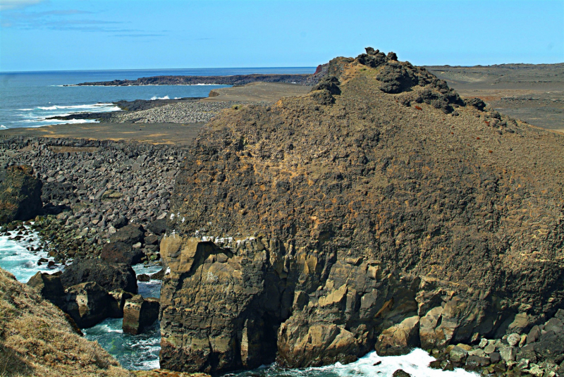 Тут,у океанского берега, потоки лавы образовали своеобразный бассеин. Черные камни и лавовые образования красиво и контрастно смотрятся на фоне голубого неба и воды..