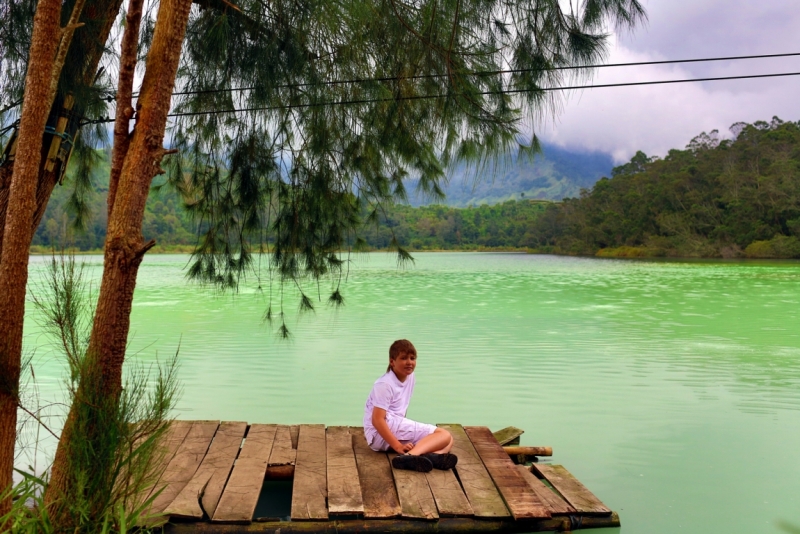 Мост, отделявший плато Диенг от внешнего мира, оказался разрушен, и на машине подъехать к нему было невозможно. Предприимчивые местные жители предложили нам продолжить путь на мотоциклах (разумеется, за дополнительную плату). Мы оказались неподготовленными путешественниками и совершенно ничего не знали о том, что можно посмотреть на плато Диенг. Мотоциклисты привезли нас к лесному озеру Telaga Warna . Мы бродили по его берегам и не могли понять, зачем мы здесь: озеро было самым обычным. Если бы не яркий зеленый цвет и резкий запах сероводорода, его можно было бы назвать даже невзрачным.