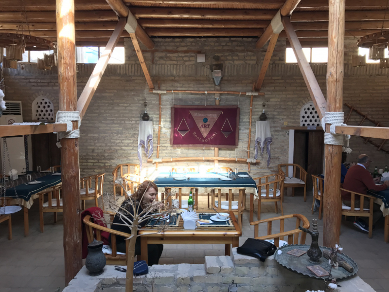 Узбекская кухня – праздник живота, обжорства, взрыва вкусов в полости рта и страх взойти на весы после. Рестораны Узбекистана в подавляющем большинстве пестуют свою родную кухню и это правильно. Есть чем гордится. Но в столице есть множество и других кухонь мира. А в посещённых нами других городах вы всегда сможете найти московско-европейского уровня кофейни с великолепными классическими десертами, разбавленными аутентичной узбекской выпечкой. Традиционно узбекская кухня делится на региональную. И перед вами предстают десяток вариантов плова, десятки разновидностей шашлыка. В общем, чтобы попробовать всё, нужно остаться в стране на месяц, если только вы не способны свой день разделять на 10-20 приемов пищи. Сейчас начну предварительно извиняться. Сначала прошу прощения у армян. До поездки в Среднюю Азию мы отдавали безусловную пальму первенства по номинации «Лучший шашлык планеты Земля» именно Армении. Но теперь этот приз уходит Узбекистану. Во-первых, за ассортимент. Разновидностей шашлыка куча. Во-вторых, за маринады. Совсем не хотим сказать, что армянский шашлык плох, просто у него есть достойный конкурент, который его обгоняет на пол шпажки. Теперь прошу прощения у грузин. Когда вы создали свои великолепные хинкали, мир вам зааплодировал. Когда же узбеки придумали свои манты из тончайшего теста, мир пал ниц в восторженном поклоне. Как назвала манты ласково одна официантка «мантышки». Когда же узбеки додумали делать манты с тыквой, все вегетарианцы пришли также в неописуемый восторг. Конечно, узбекская кухня не может существовать без баранов. Достаточно сказать, что даже говяжий шашлык перекладывается курдючным жиром для сочности. Если вы берете плов с говядиной, то будьте уверены, его скорее всего приготовили на курдючном сале. Баранина и ягнятина во всех видах покорит вкусовые рецепторы гурманов. Но в нашей семье, так уж повелось, что жена категорически не выносит не только вкус, но и запах барана. Если кто-то скажет, что хорошо приготовленный бараний шашлык не имеет специфического запаха, то у вас просто некачественные рецепторы. Супруга чует запах за столько метров, за сколько многие не способны даже увидеть барана. Поэтому до поездки я слышал её вздохи о том, что уж, что-что, а ей придётся голодать в Узбекистане и, она будет просто наслаждаться окружающими достопримечательностями. Но всё оказалось совсем не фатально для неё. Шашлыки из курицы были приняты «на ура» супругой, потом в ход пошли прекрасные супы из говядины (шурпа и т.д.). Ну а когда в меню появлялись блюда из тыквы, восторгу не было предела. В последний день дошло до того, что жена заказала (невиданное для неё дело!) вместо обычного одного блюда сразу манты с тыквой, тыквенный суп и неповторимый Ачик-Чучук, так ей не хотелось расставаться с узбекской кухней. Весь это праздник живота в Узбекистане сопровождается всегда аутентичной обстановкой, коврами, танцами и прочими радостями. Поэтому атмосфера ресторанов побуждает не торопиться их покинуть. Кроме вышеупомянутого Бадреддина в Бухаре. Из всех посещённых точек общепита страны нашей любви и упоминания здесь заслужили SATO, г. Ташкент (группа Karavan), Samarkand в Самарканде, Khorezm Art Restaurant, г. Хива.