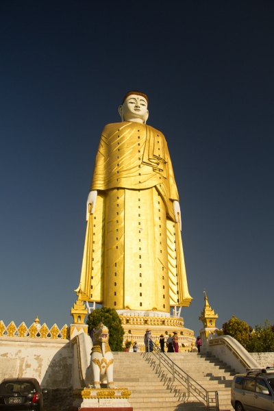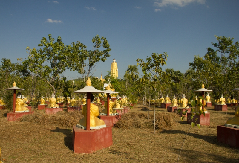 В Моньве довезли до отеля (King&Queen 9 из 10 только за полнейшее отсутствия Интернета, все остальное на высоте). На семейном совете о плане в Моньве решили первые полдня уделить самому большому стоячему Будде, на второй съездить в пещеры Pho Win Taung. Решили воспользоваться предлагаемым в отеле байком (15 000 кьят в день). До комплекса с огромными Стоячим/лежачими на боку/лежащим на спине/строящимся сидячим Буддами дорога хорошая, 15 км, на байке 20 минут. По дороге встречаются пункты сбора за проезд - но для байков дороги бесплатные, для проезда tall есть спец выделенная полоса. Первым пунктом на пути из Моньвы будет, как выразился один коллега с форума - "самый гламурный храм" - Thanboddhay Phaya.
