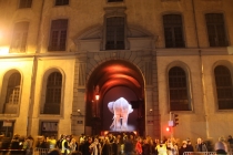 7 и 8. Hotel-Dieu & Cour d”Honneur de l” Hotel-Dieu. Когда подошли в первый раз, на здание проецировался какой-то невнятный рисунок, во двор стояла 200-метровая очередь, которая, надо отдать ей должное, очень быстро двигалась. Когда прошли во двор, там просто менялось освещение стен и играла музыка. Ну просто деревенская дискотека. Во второй раз было интересное шоу на здании Hotel-Dieu. Окна, двери как бы вырезались из бумаги. Но все очень бледненько, фотографии не получились бы. Но и задумка, и исполнение интересные.
