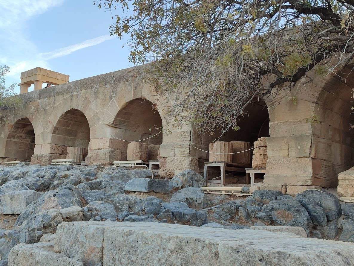 В общем, Линдос, как и Родос – это такое концентрированное воплощение истории. Как античной, так и средневековой. Вот, например, путь на знаменитый Акрополь начинается с изображения триеры полководца Агесандра, высеченной в скале в 170 г. до н.э. Идущая наверх лестница (как и стены по периметру Акрополя) построена Рыцарями, а над входом в ворота находится герб Великого магистра д’Обюссона. На первом уровне Акрополя находятся цистерны византийского времени для воды и зерна, Дальше идут Портик, построенный в III веке до н.э. , развалины Византийской церкви Святого Иоанна, «небесная лестница», ну и Храм Богини Афины и другие древние достопримечательности. Но даже если не знаешь всех этих исторических подробностей, то тебя наполняет ощущение того, что перед тобой открываются страницы истории. А потрясающие виды на окрестности наполняют душу восторгом и спокойствием одновременно. В общем, ощущение прикосновения к вечности.